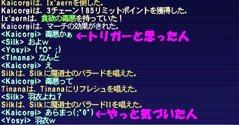 ボスのIx’aernと同時に狩タイプのQn’aernが2体沸くので、まずはボスと狩アーンを赤さんが一体ずつマラソンし、のーきんず☆で残った狩>狩>ボスの順番で倒して行きました。